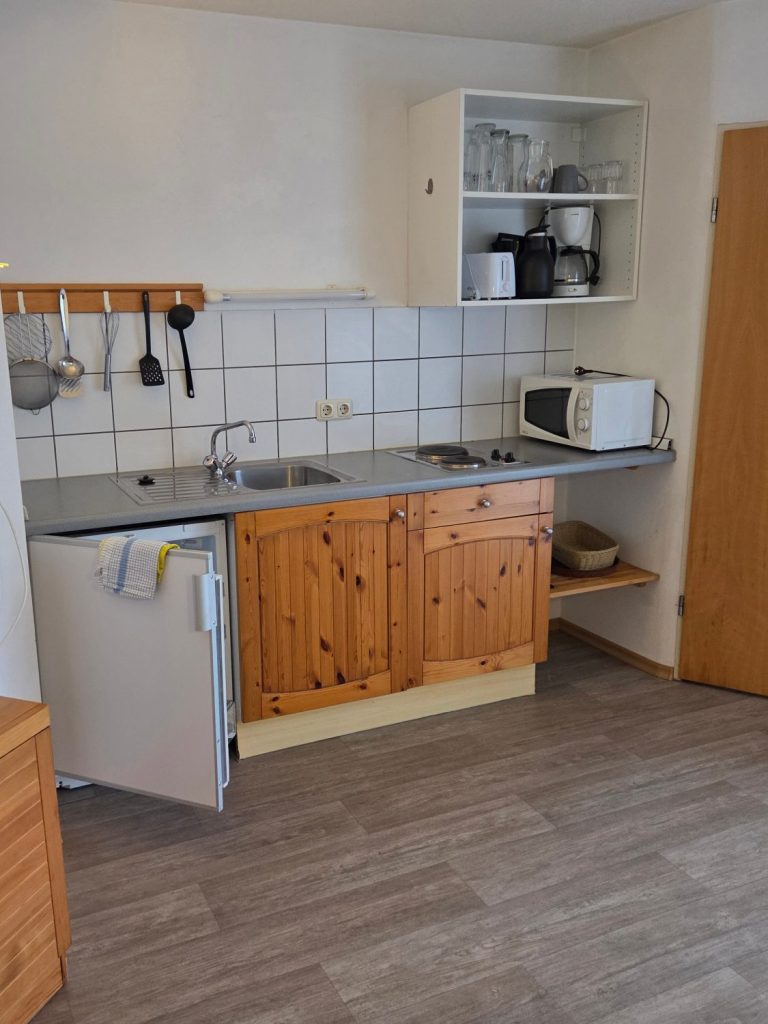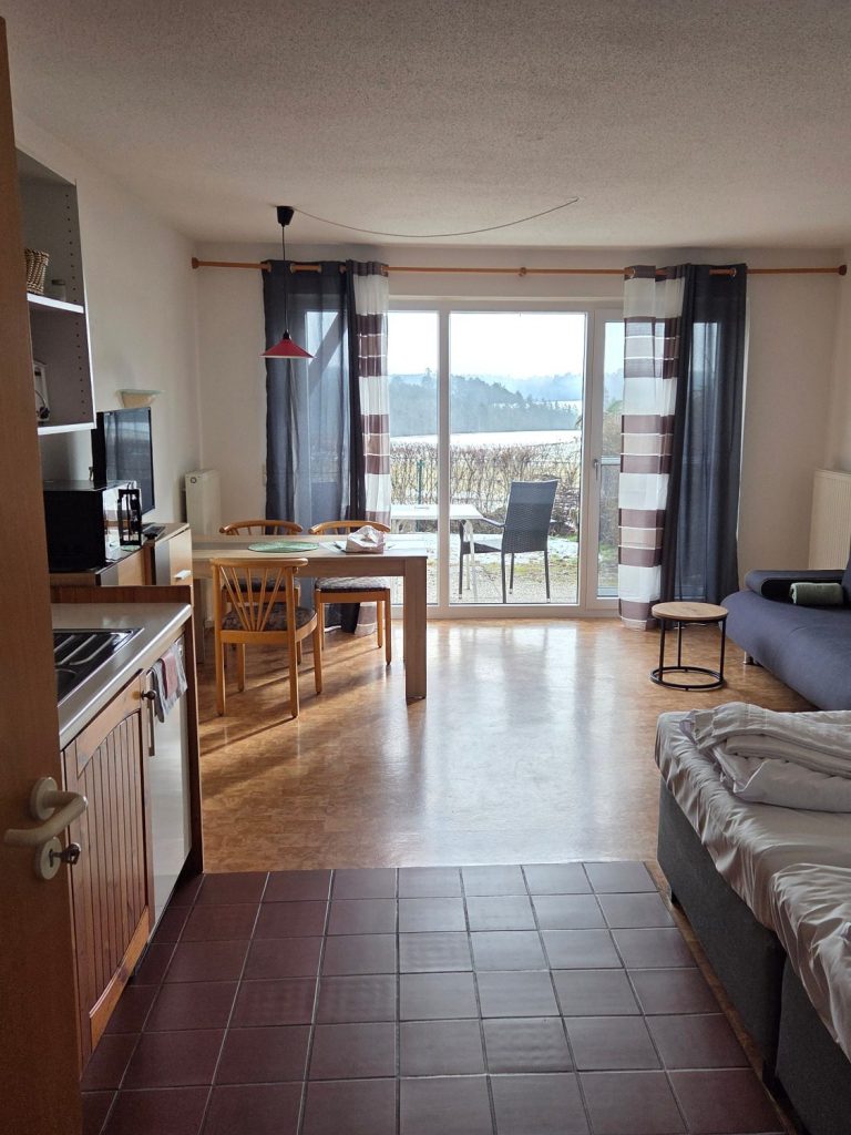 Ein großer, heller Raum - Küchenzeile, Wohn- und Schlafbereich - separates Badezimmer sowie separater Eingangsbereich - Gartenterrasse